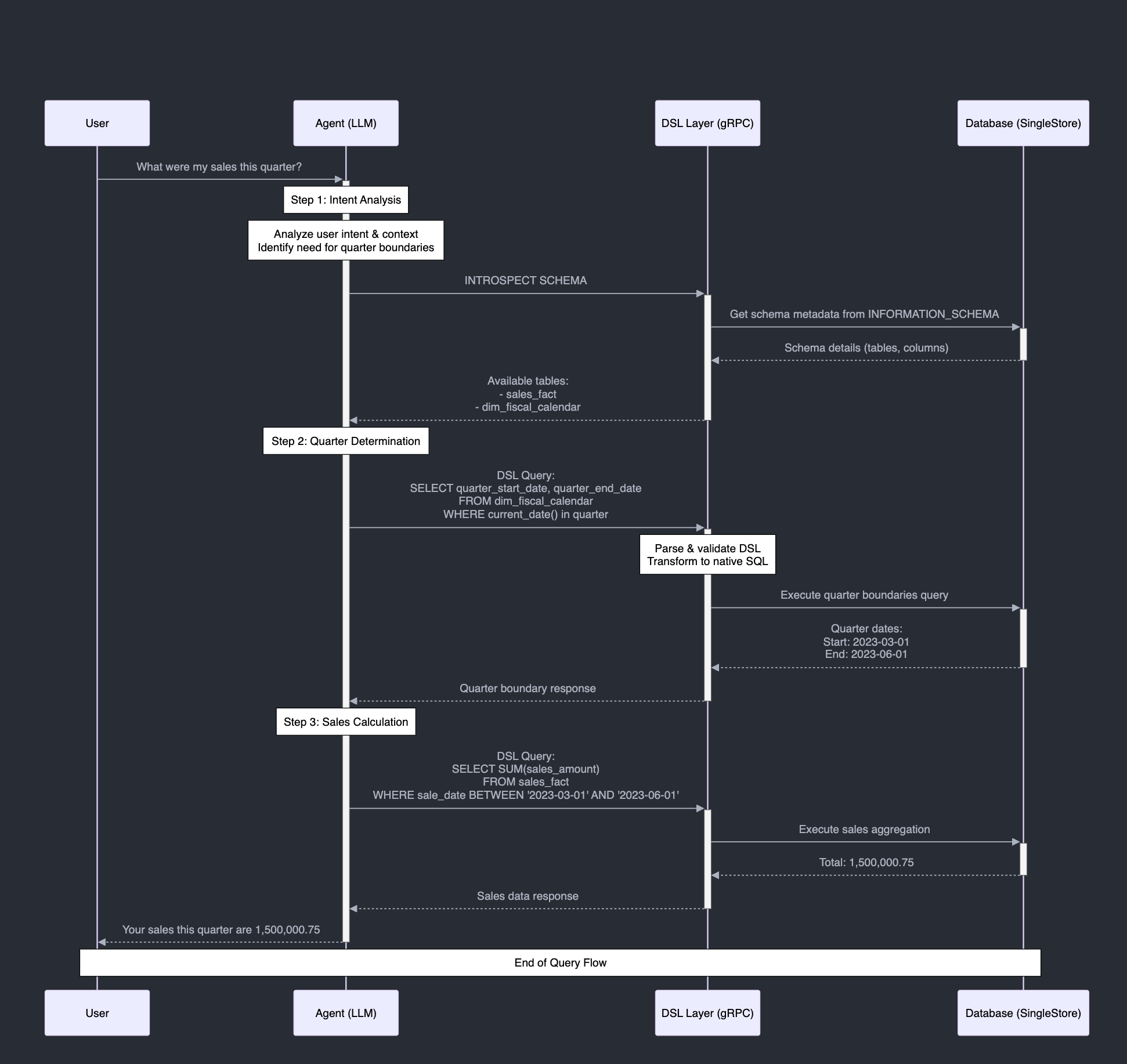 Now that the LLM knows the exact date range, it issues another DSL query to sum sales amounts from sales_fact within these dates. The DSL service again validates, translates, and executes the query on the database.Returning the result: